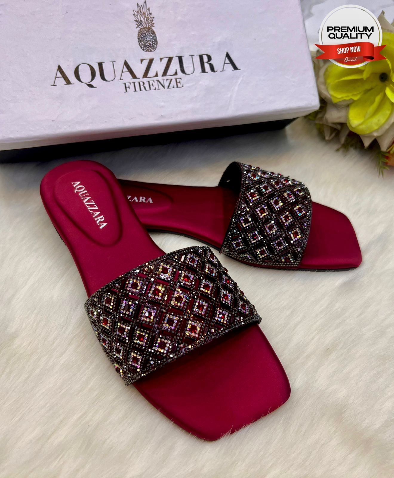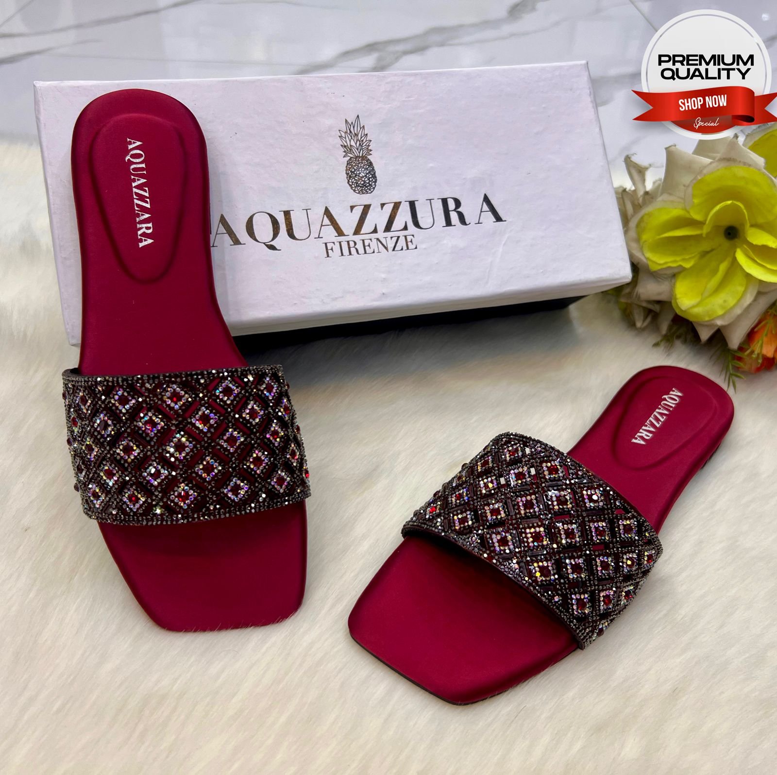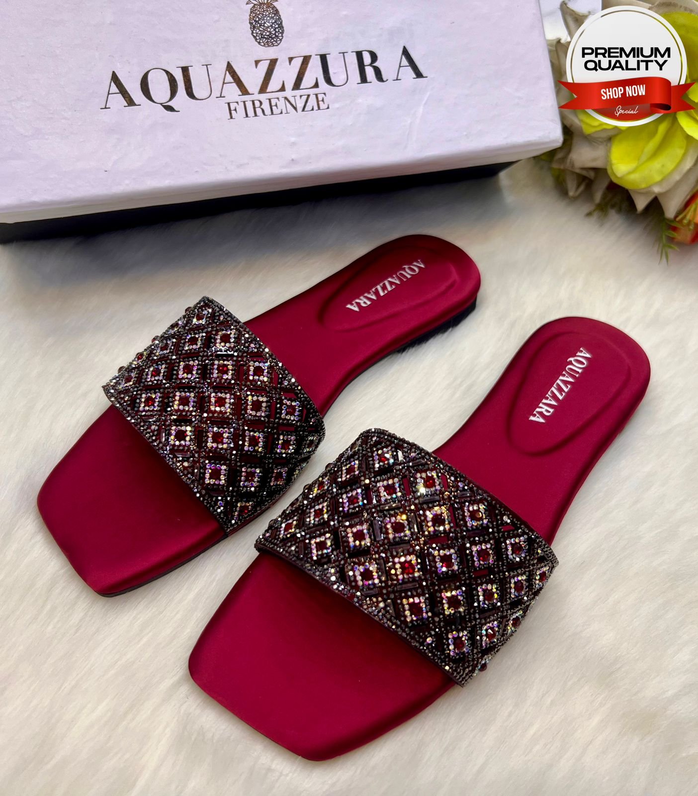 tep into effortless elegance with the Aquazzura Firenze Embellished Flat Slide Sandals for Women. Designed with a chic open-toe silhouette and luxurious embellishments, these versatile slides add instant glamour to casual and dressy outfits. Perfect for summer events, vacations, or everyday wear, they combine comfort with sophisticated Italian craftsmanship. A must-have statement piece for fashion-forward women who appreciate timeless style.