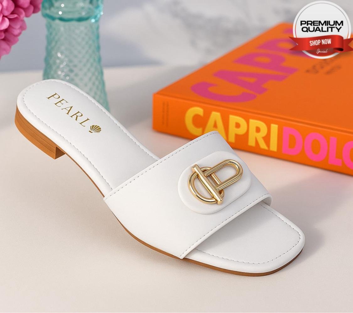 Chic Flat Slide Sandals with Gold Buckle Detailing for Women (White)